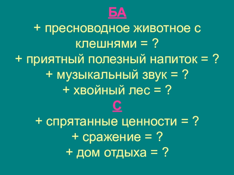 Слайд 8БА + пресноводное животное с клешнями = ? + приятный полезный напиток
