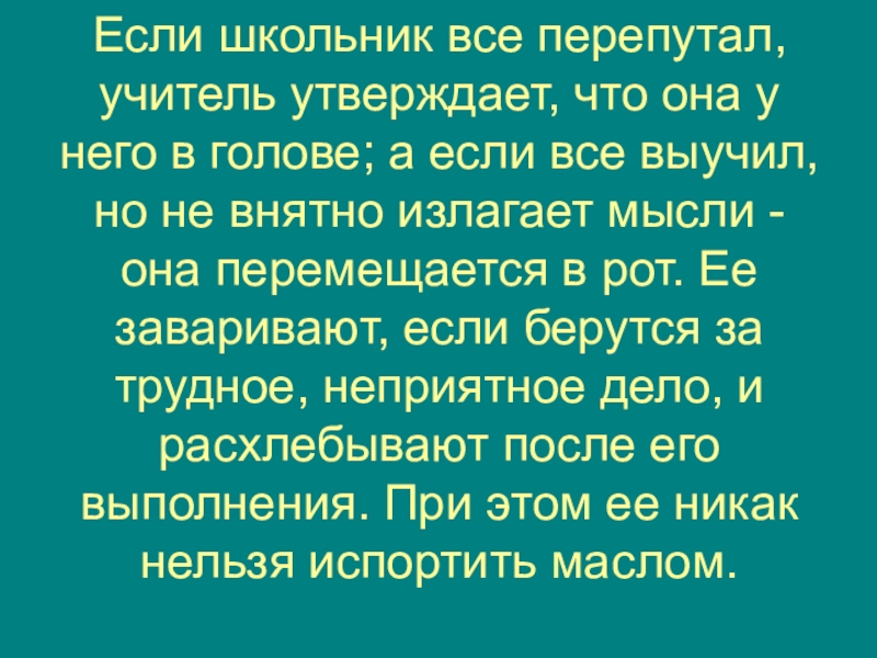 голове; а если все выучил, но не внятно излагает мысли - она перемещается в рот. Ее заваривают, если берутся за трудное, неприятное дело, и расхлебывают после его выполнения. При этом ее никак нельзя испортить маслом.