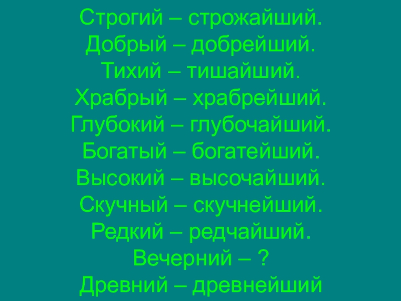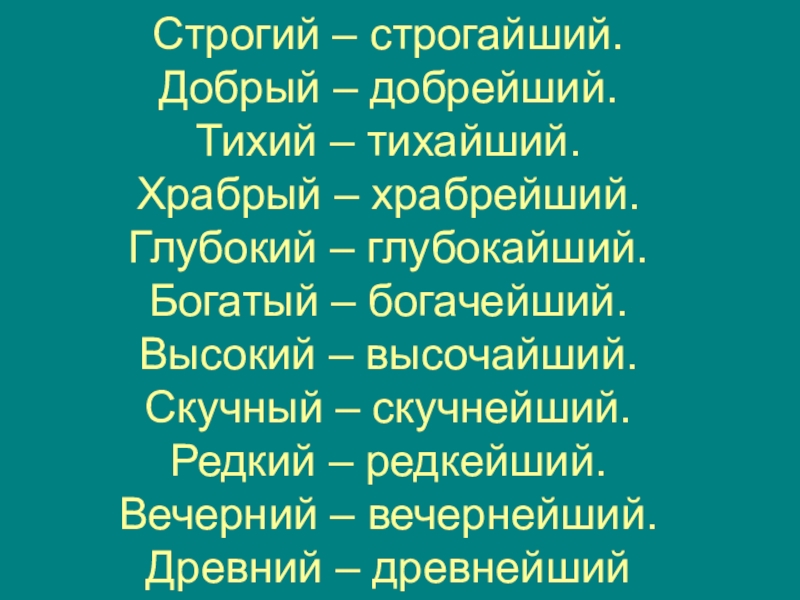 Строгий – строгайший. Добрый – добрейший. Тихий – тихайший. Храбрый – храбрейший. Глубокий – глубокайший. Богатый –