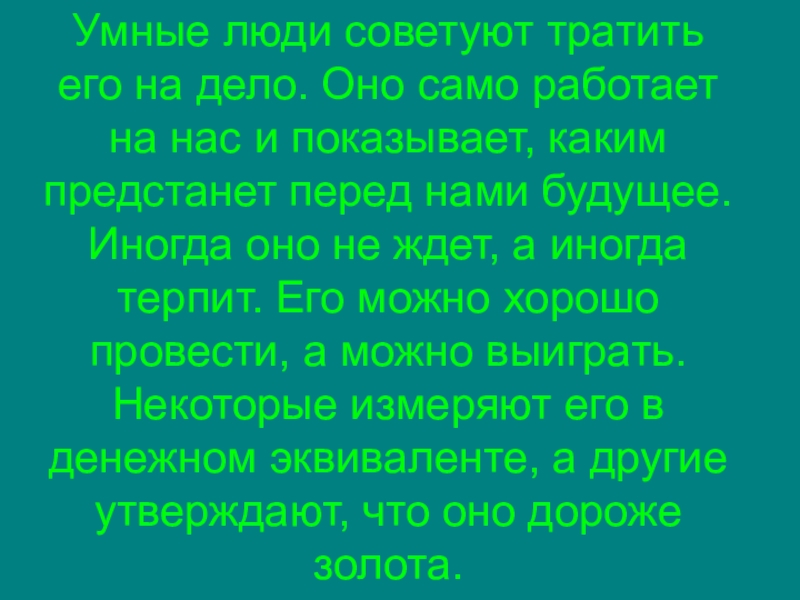 нас и показывает, каким предстанет перед нами будущее. Иногда оно не ждет, а иногда терпит. Его можно хорошо провести, а можно выиграть. Некоторые измеряют его в денежном эквиваленте, а другие утверждают, что оно дороже золота.