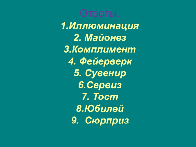 Слайд 20Ответы. 1.Иллюминация 2. Майонез 3.Комплимент 4. Фейерверк 5. Сувенир 6.Сервиз 7. Тост 8.Юбилей 9. Сюрприз