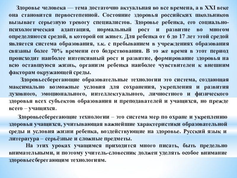 Здоровьесберегающие технологии – это система мер по охране и укреплению здоровья учащихся, учитывающая важнейшие характеристики образовательной среды и условия жизни ребенка, воздействующие на здоровье. Русский язык и литература – серьёзные и сложные предметы.
