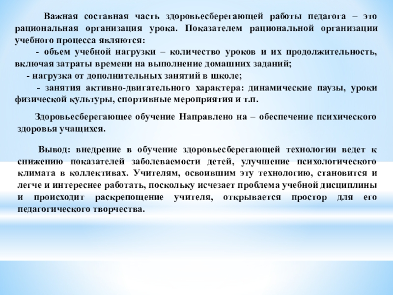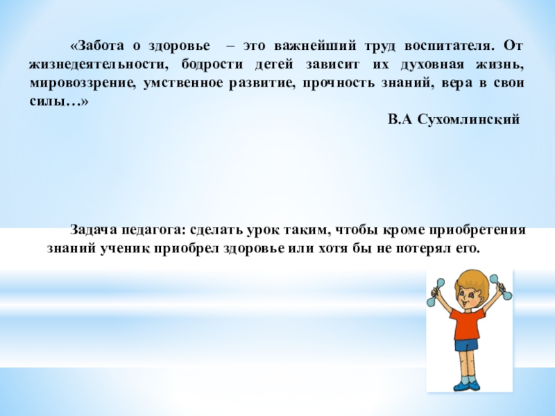Задача педагога: сделать урок таким, чтобы кроме приобретения знаний ученик приобрел здоровье или хотя бы не потерял его.