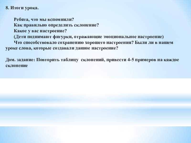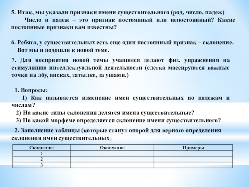 7. Для восприятия новой темы учащиеся делают физ. упражнения на стимуляцию интеллектуальной деятельности (слегка массируются важные точки на лбу, висках, затылке, за ушами.)