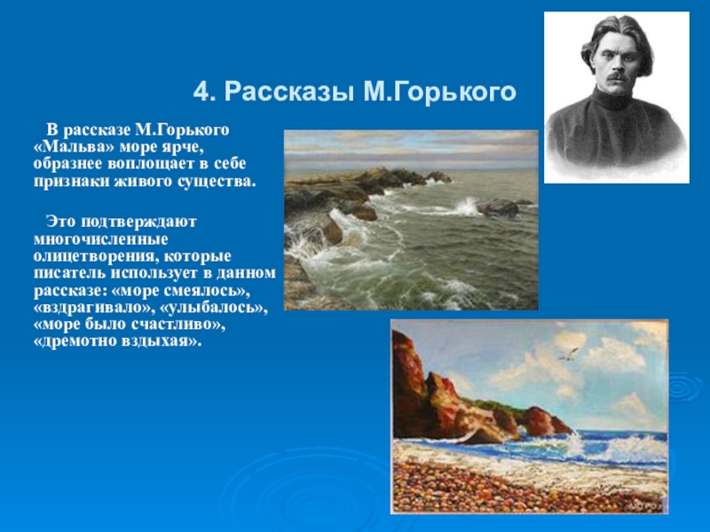 Это подтверждают многочисленные олицетворения, которые писатель использует в данном рассказе: «море смеялось», «вздрагивало», «улыбалось», «море было счастливо», «дремотно вздыхая».
