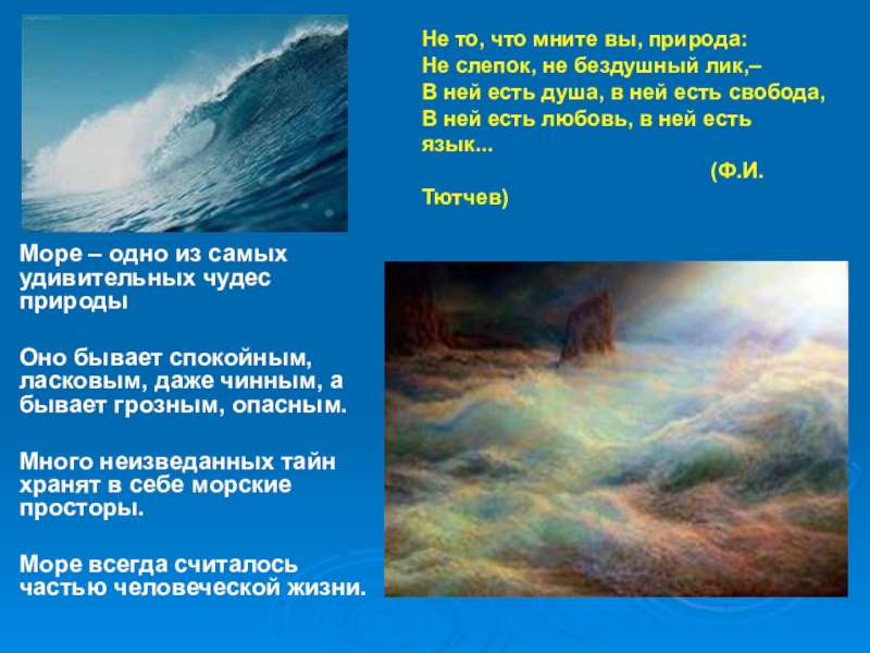 У Тютчева море – живое существо, которым поэт любуется, удивляется его великой морской стихии, которое способно очаровать и загипнотизировать человека.