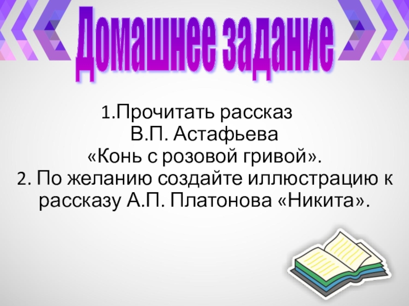 Слайд 18Прочитать рассказ В.П. Астафьева «Конь с розовой гривой». 2. По желанию создайте