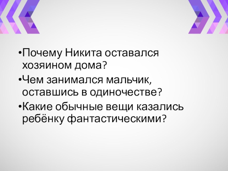 Почему Никита оставался хозяином дома?Чем занимался мальчик, оставшись в одиночестве?Какие обычные вещи казались ребёнку фантастическими?