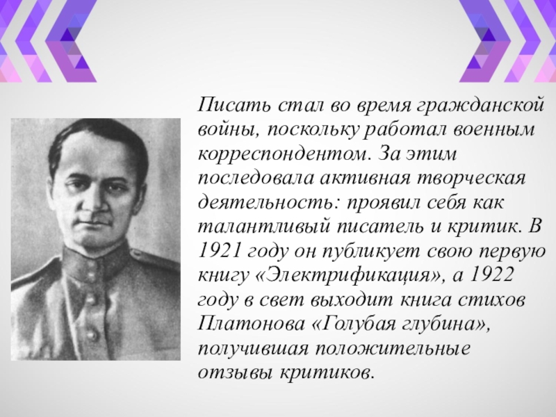 этим последовала активная творческая деятельность: проявил себя как талантливый писатель и критик. В 1921 году он публикует свою первую книгу «Электрификация», а 1922 году в свет выходит книга стихов Платонова «Голубая глубина», получившая положительные отзывы критиков.