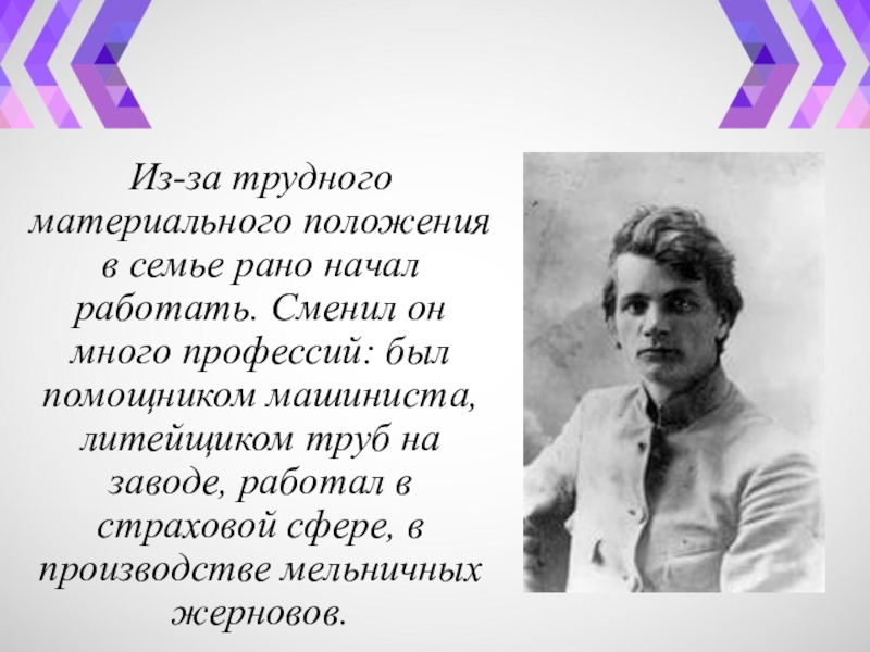Слайд 3Из-за трудного материального положения в семье рано начал работать. Сменил он