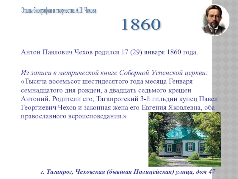 Антон Павлович Чехов родился 17 (29) января 1860 года.