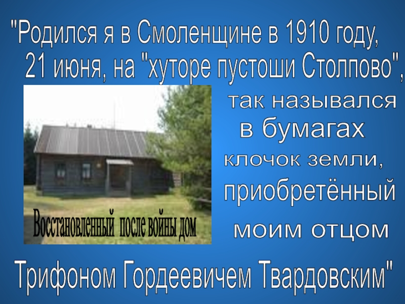 В гезете "Смоленская деревня" летом 1925 года появилось моё первое напечатанное стихотворение "Новая изба"