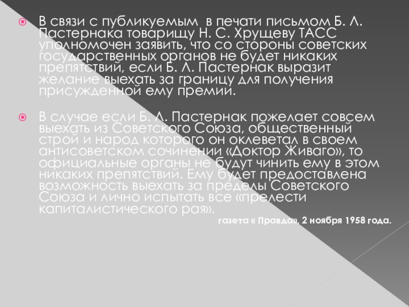 НЕСМОТРЯ НА ОЖИДАНИЯ ПРАВИТЕЛЬСТВА ПАСТЕРНАК ОТКАЗЫВАЕТСЯ ПОДПИСАТЬ ПИСАТЕЛЬСКОЕ «ГНЕВНОЕ ОДОБРЕНИЕ»РАССТРЕЛУ СОВЕТ-
