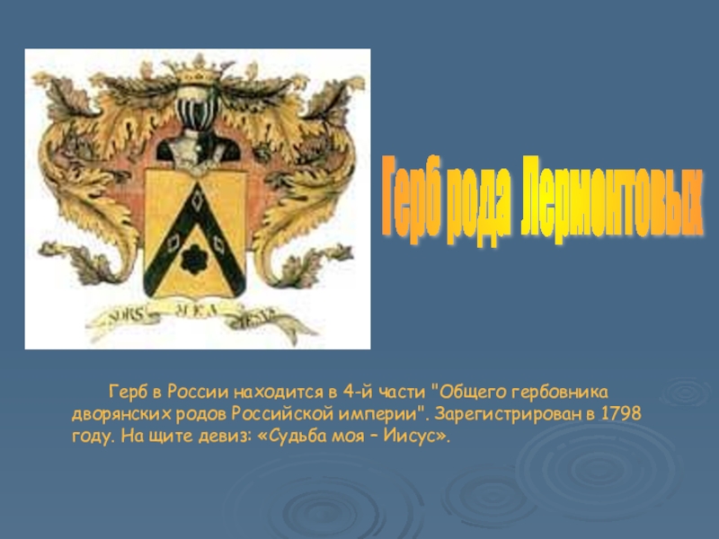 Род Лермонтовых восходит к средним векам и легендарен в своих истоках, - он начинается с шотландского поэта Томаса Лермонта, прозванного рифмачом. Также Лермонты появились в шотландском замке Дерси в середине XV века.