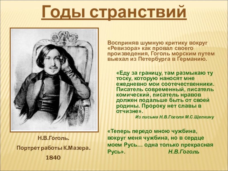 «Еду за границу, там размыкаю ту тоску, которую наносят мне ежедневно мои соотечественники. Писатель современный, писатель комический, писатель нравов должен подальше быть от своей родины. Пророку нет славы в отчизне».