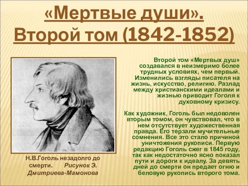 Мучительные переживания, вызванные неразрешимыми социальными противоречиями, и тяжелая болезнь подтачивали физические силы Гоголя и привели его к смерти
