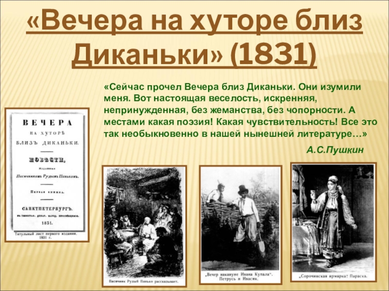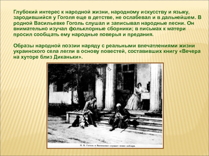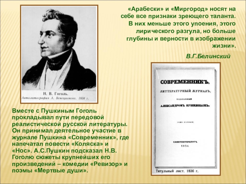 Вместе с Пушкиным Гоголь прокладывал пути передовой реалистической русской литературы. Он принимал деятельное участие в журнале Пушкина «Современник», где напечатал повести «Коляска» и «Нос». А.С.Пушкин подсказал Н.В.Гоголю сюжеты крупнейших его произведений – комедии «Ревизор» и поэмы «Мертвые души».