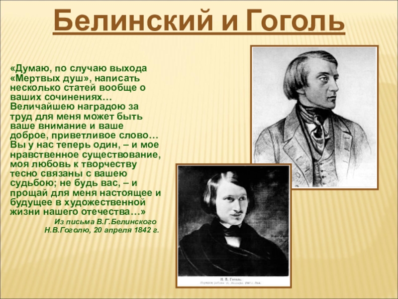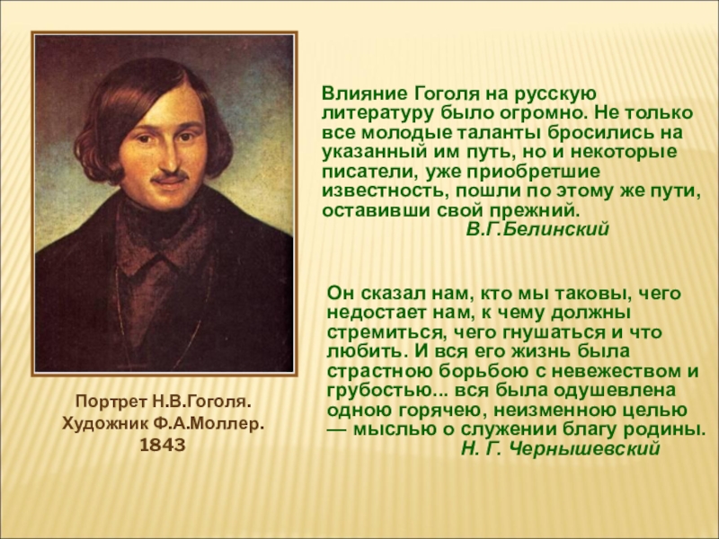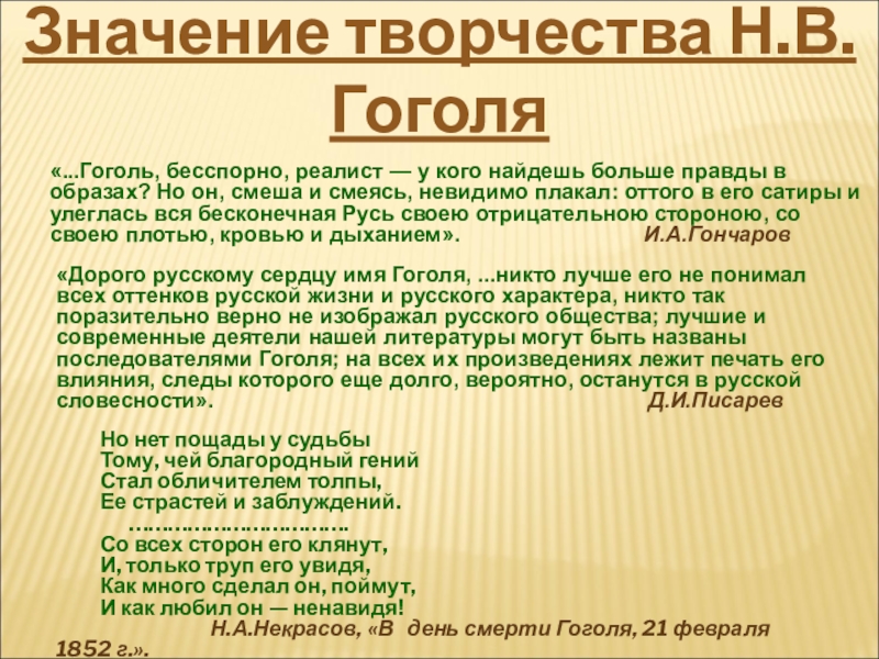 «Дорого русскому сердцу имя Гоголя, ...никто лучше его не понимал всех оттенков русской жизни и русского характера, никто так поразительно верно не изображал русского общества; лучшие и современные деятели нашей литературы могут быть названы последователями Гоголя; на всех их произведениях лежит печать его влияния, следы которого еще долго, вероятно, останутся в русской словесности». Д.И.Писарев