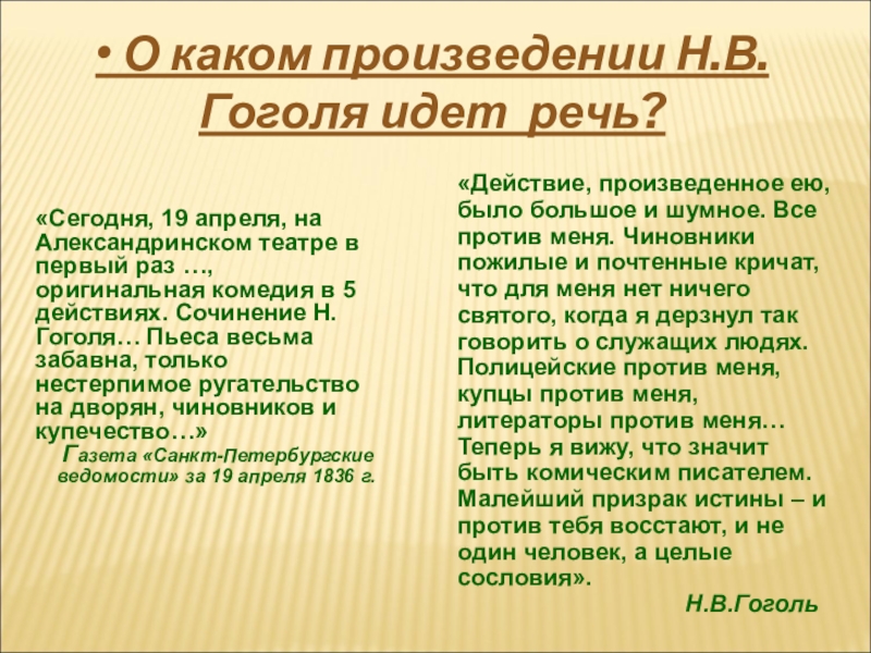 «Действие, произведенное ею, было большое и шумное. Все против меня. Чиновники пожилые и почтенные кричат, что для меня нет ничего святого, когда я дерзнул так говорить о служащих людях. Полицейские против меня, купцы против меня, литераторы против меня… Теперь я вижу, что значит быть комическим писателем. Малейший призрак истины – и против тебя восстают, и не один человек, а целые сословия».
