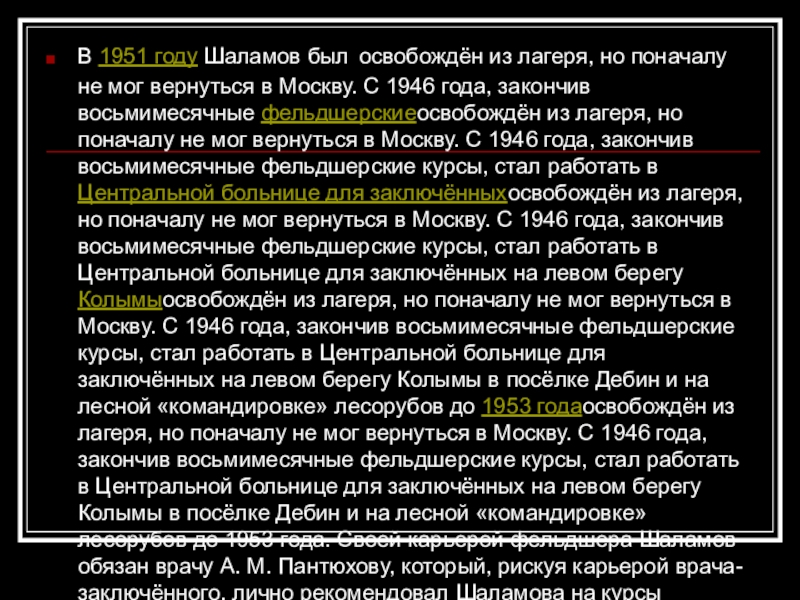 мог вернуться в Москву. С 1946 года, закончив восьмимесячные фельдшерскиеосвобождён из лагеря, но поначалу не мог вернуться в Москву. С 1946 года, закончив восьмимесячные фельдшерские курсы, стал работать в Центральной больнице для заключённыхосвобождён из лагеря, но поначалу не мог вернуться в Москву. С 1946 года, закончив восьмимесячные фельдшерские курсы, стал работать в Центральной больнице для заключённых на левом берегу Колымыосвобождён из лагеря, но поначалу не мог вернуться в Москву. С 1946 года, закончив восьмимесячные фельдшерские курсы, стал работать в Центральной больнице для заключённых на левом берегу Колымы в посёлке Дебин и на лесной «командировке» лесорубов до 1953 годаосвобождён из лагеря, но поначалу не мог вернуться в Москву. С 1946 года, закончив восьмимесячные фельдшерские курсы, стал работать в Центральной больнице для заключённых на левом берегу Колымы в посёлке Дебин и на лесной «командировке» лесорубов до 1953 года. Своей карьерой фельдшера Шаламов обязан врачу А. М. Пантюхову, который, рискуя карьерой врача-заключённого, лично рекомендовал Шаламова на курсы фельдшеров. Затем жил в Калининской областиосвобождён из лагеря, но поначалу не мог вернуться в Москву. С 1946 года, закончив восьмимесячные фельдшерские курсы, стал работать в Центральной больнице для заключённых на левом берегу Колымы в посёлке Дебин и на лесной «командировке» лесорубов до 1953 года. Своей карьерой фельдшера Шаламов обязан врачу А. М. Пантюхову, который, рискуя карьерой врача-заключённого, лично рекомендовал Шаламова на курсы фельдшеров. Затем жил в Калининской области, работал в Решетниковоосвобождён из лагеря, но поначалу не мог вернуться в Москву. С 1946 года, закончив восьмимесячные фельдшерские курсы, стал работать в Центральной больнице для заключённых на левом берегу Колымы в посёлке Дебин и на лесной «командировке» лесорубов до 1953 года. Своей карьерой фельдшера Шаламов обязан врачу А. М. Пантюхову, который, рискуя карьерой врача-заключённого, лично рекомендовал Шаламова на курсы фельдшеров. Затем жил в Калининской области, работал в Решетниково. Результатами репрессий стали распад семьи и подорванное здоровье. В 1956 годуосвобождён из лагеря, но поначалу не мог вернуться в Москву. С 1946 года, закончив восьмимесячные фельдшерские курсы, стал работать в Центральной больнице для заключённых на левом берегу Колымы в посёлке Дебин и на лесной «командировке» лесорубов до 1953 года. Своей карьерой фельдшера Шаламов обязан врачу А. М. Пантюхову, который, рискуя карьерой врача-заключённого, лично рекомендовал Шаламова на курсы фельдшеров. Затем жил в Калининской области, работал в Решетниково. Результатами репрессий стали распад семьи и подорванное здоровье. В 1956 году после реабилитации вернулся в Москву.