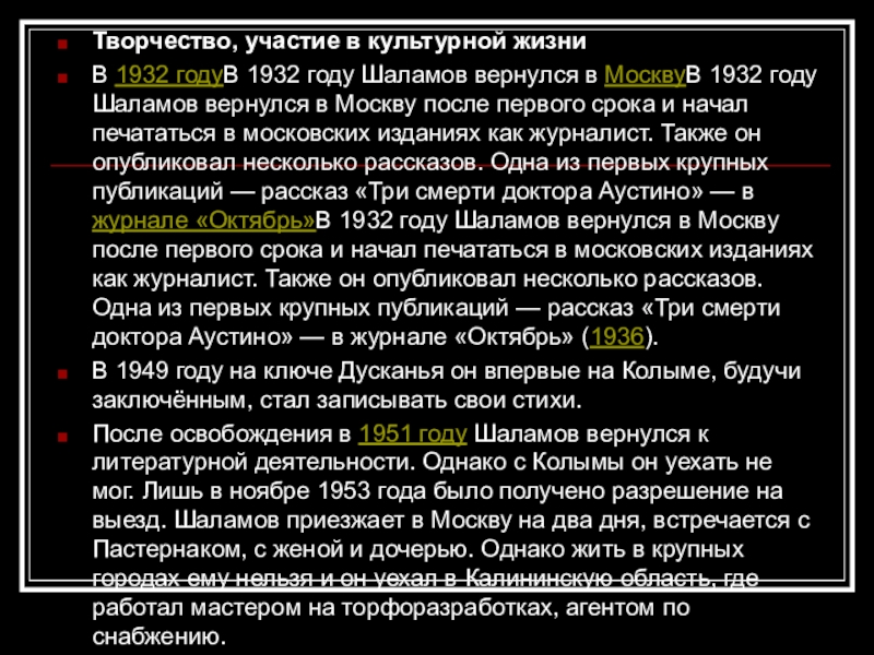 в МосквуВ 1932 году Шаламов вернулся в Москву после первого срока и начал печататься в московских изданиях как журналист. Также он опубликовал несколько рассказов. Одна из первых крупных публикаций — рассказ «Три смерти доктора Аустино» — в журнале «Октябрь»В 1932 году Шаламов вернулся в Москву после первого срока и начал печататься в московских изданиях как журналист. Также он опубликовал несколько рассказов. Одна из первых крупных публикаций — рассказ «Три смерти доктора Аустино» — в журнале «Октябрь» (1936).