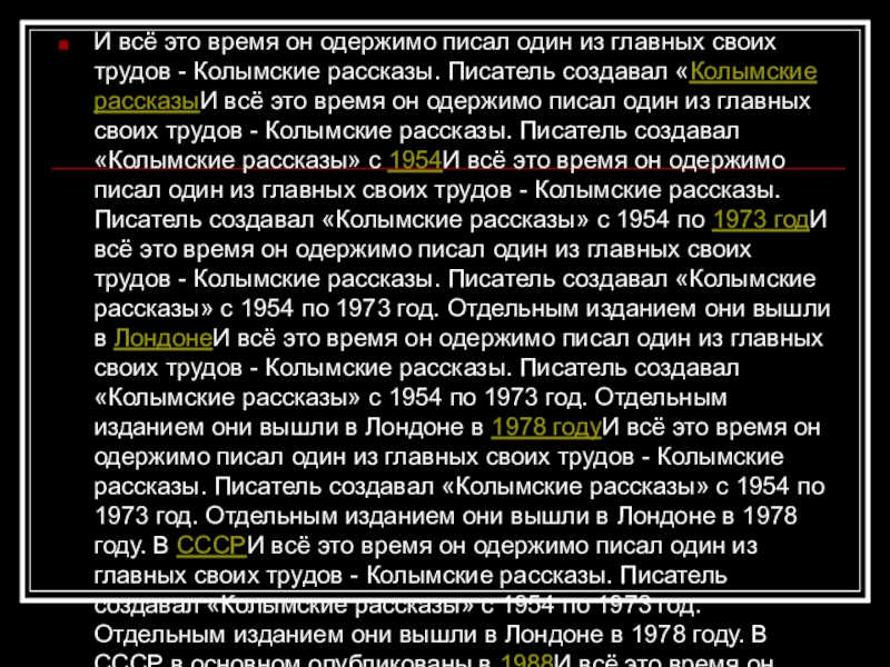 трудов - Колымские рассказы. Писатель создавал «Колымские рассказыИ всё это время он одержимо писал один из главных своих трудов - Колымские рассказы. Писатель создавал «Колымские рассказы» с 1954И всё это время он одержимо писал один из главных своих трудов - Колымские рассказы. Писатель создавал «Колымские рассказы» с 1954 по 1973 годИ всё это время он одержимо писал один из главных своих трудов - Колымские рассказы. Писатель создавал «Колымские рассказы» с 1954 по 1973 год. Отдельным изданием они вышли в ЛондонеИ всё это время он одержимо писал один из главных своих трудов - Колымские рассказы. Писатель создавал «Колымские рассказы» с 1954 по 1973 год. Отдельным изданием они вышли в Лондоне в 1978 годуИ всё это время он одержимо писал один из главных своих трудов - Колымские рассказы. Писатель создавал «Колымские рассказы» с 1954 по 1973 год. Отдельным изданием они вышли в Лондоне в 1978 году. В СССРИ всё это время он одержимо писал один из главных своих трудов - Колымские рассказы. Писатель создавал «Колымские рассказы» с 1954 по 1973 год. Отдельным изданием они вышли в Лондоне в 1978 году. В СССР в основном опубликованы в 1988И всё это время он одержимо писал один из главных своих трудов - Колымские рассказы. Писатель создавал «Колымские рассказы» с 1954 по 1973 год. Отдельным изданием они вышли в Лондоне в 1978 году. В СССР в основном опубликованы в 1988—1990 годахИ всё это время он одержимо писал один из главных своих трудов - Колымские рассказы. Писатель создавал «Колымские рассказы» с 1954 по 1973 год. Отдельным изданием они вышли в Лондоне в 1978 году. В СССР в основном опубликованы в 1988—1990 годах. Сам писатель делил свои рассказы на шесть циклов: «Колымские рассказы», «Левый берег», «Артист лопаты», а также «Очерки преступного мира», «Воскрешение лиственницы» и «Перчатка, или КР-2». Полностью они собраны в двухтомнике «Колымские рассказы» в 1992 году в серии «Крестный путь России» издательства «Советская Россия».
