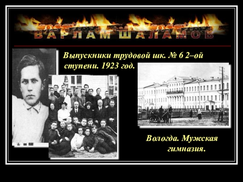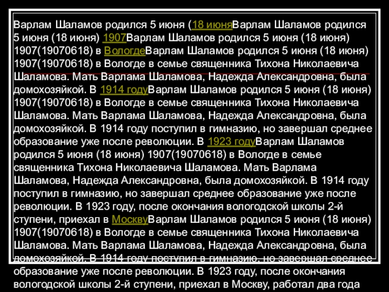 родился 5 июня (18 июня) 1907(19070618) в ВологдеВарлам Шаламов родился 5 июня (18 июня) 1907(19070618) в Вологде в семье священника Тихона Николаевича Шаламова. Мать Варлама Шаламова, Надежда Александровна, была домохозяйкой. В 1914 годуВарлам Шаламов родился 5 июня (18 июня) 1907(19070618) в Вологде в семье священника Тихона Николаевича Шаламова. Мать Варлама Шаламова, Надежда Александровна, была домохозяйкой. В 1914 году поступил в гимназию, но завершал среднее образование уже после революции. В 1923 годуВарлам Шаламов родился 5 июня (18 июня) 1907(19070618) в Вологде в семье священника Тихона Николаевича Шаламова. Мать Варлама Шаламова, Надежда Александровна, была домохозяйкой. В 1914 году поступил в гимназию, но завершал среднее образование уже после революции. В 1923 году, после окончания вологодской школы 2-й ступени, приехал в МосквуВарлам Шаламов родился 5 июня (18 июня) 1907(19070618) в Вологде в семье священника Тихона Николаевича Шаламова. Мать Варлама Шаламова, Надежда Александровна, была домохозяйкой. В 1914 году поступил в гимназию, но завершал среднее образование уже после революции. В 1923 году, после окончания вологодской школы 2-й ступени, приехал в Москву, работал два года дубильщиком на кожевенном заводе в КунцевеВарлам Шаламов родился 5 июня (18 июня) 1907(19070618) в Вологде в семье священника Тихона Николаевича Шаламова. Мать Варлама Шаламова, Надежда Александровна, была домохозяйкой. В 1914 году поступил в гимназию, но завершал среднее образование уже после революции. В 1923 году, после окончания вологодской школы 2-й ступени, приехал в Москву, работал два года дубильщиком на кожевенном заводе в Кунцеве . С 1926Варлам Шаламов родился 5 июня (18 июня) 1907(19070618) в Вологде в семье священника Тихона Николаевича Шаламова. Мать Варлама Шаламова, Надежда Александровна, была домохозяйкой. В 1914 году поступил в гимназию, но завершал среднее образование уже после революции. В 1923 году, после окончания вологодской школы 2-й ступени, приехал в Москву, работал два года дубильщиком на кожевенном заводе в Кунцеве . С 1926 по 1929Варлам Шаламов родился 5 июня (18 июня) 1907(19070618) в Вологде в семье священника Тихона Николаевича Шаламова. Мать Варлама Шаламова, Надежда Александровна, была домохозяйкой. В 1914 году поступил в гимназию, но завершал среднее образование уже после революции. В 1923 году, после окончания вологодской школы 2-й ступени, приехал в Москву, работал два года дубильщиком на кожевенном заводе в Кунцеве . С 1926 по 1929 г. учился на факультете советского права МГУ.