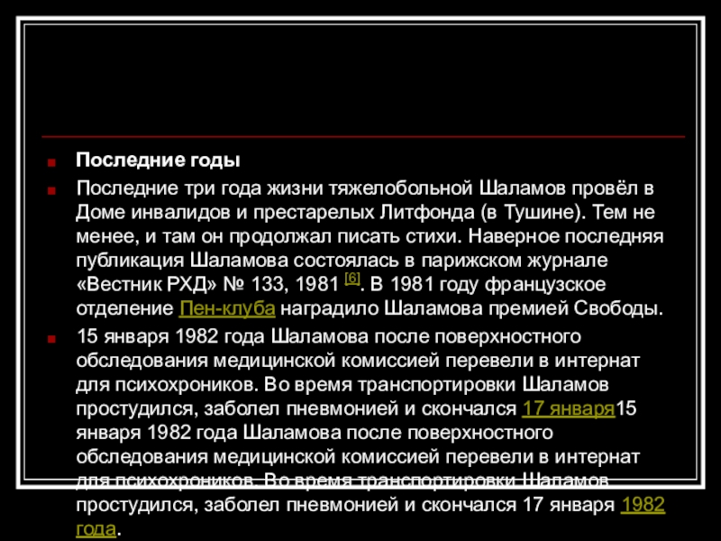 15 января 1982 года Шаламова после поверхностного обследования медицинской комиссией перевели в интернат для психохроников. Во время транспортировки Шаламов простудился, заболел пневмонией и скончался 17 января15 января 1982 года Шаламова после поверхностного обследования медицинской комиссией перевели в интернат для психохроников. Во время транспортировки Шаламов простудился, заболел пневмонией и скончался 17 января 1982 года.
