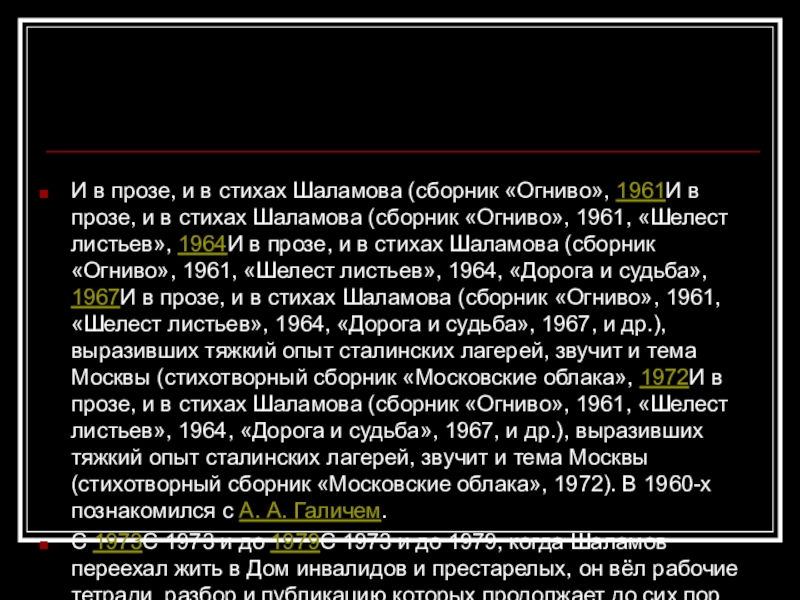 прозе, и в стихах Шаламова (сборник «Огниво», 1961, «Шелест листьев», 1964И в прозе, и в стихах Шаламова (сборник «Огниво», 1961, «Шелест листьев», 1964, «Дорога и судьба», 1967И в прозе, и в стихах Шаламова (сборник «Огниво», 1961, «Шелест листьев», 1964, «Дорога и судьба», 1967, и др.), выразивших тяжкий опыт сталинских лагерей, звучит и тема Москвы (стихотворный сборник «Московские облака», 1972И в прозе, и в стихах Шаламова (сборник «Огниво», 1961, «Шелест листьев», 1964, «Дорога и судьба», 1967, и др.), выразивших тяжкий опыт сталинских лагерей, звучит и тема Москвы (стихотворный сборник «Московские облака», 1972). В 1960-х познакомился с А. А. Галичем.