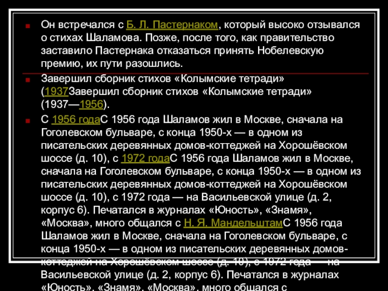 С 1956 годаС 1956 года Шаламов жил в Москве, сначала на Гоголевском бульваре, с конца 1950-х — в одном из писательских деревянных домов-коттеджей на Хорошёвском шоссе (д. 10), с 1972 годаС 1956 года Шаламов жил в Москве, сначала на Гоголевском бульваре, с конца 1950-х — в одном из писательских деревянных домов-коттеджей на Хорошёвском шоссе (д. 10), с 1972 года — на Васильевской улице (д. 2, корпус 6). Печатался в журналах «Юность», «Знамя», «Москва», много общался с Н. Я. МандельштамС 1956 года Шаламов жил в Москве, сначала на Гоголевском бульваре, с конца 1950-х — в одном из писательских деревянных домов-коттеджей на Хорошёвском шоссе (д. 10), с 1972 года — на Васильевской улице (д. 2, корпус 6). Печатался в журналах «Юность», «Знамя», «Москва», много общался с Н. Я. Мандельштам, О. В. ИвинскойС 1956 года Шаламов жил в Москве, сначала на Гоголевском бульваре, с конца 1950-х — в одном из писательских деревянных домов-коттеджей на Хорошёвском шоссе (д. 10), с 1972 года — на Васильевской улице (д. 2, корпус 6). Печатался в журналах «Юность», «Знамя», «Москва», много общался с Н. Я. Мандельштам, О. В. Ивинской, А. И. СолженицынымС 1956 года Шаламов жил в Москве, сначала на Гоголевском бульваре, с конца 1950-х — в одном из писательских деревянных домов-коттеджей на Хорошёвском шоссе (д. 10), с 1972 года — на Васильевской улице (д. 2, корпус 6). Печатался в журналах «Юность», «Знамя», «Москва», много общался с Н. Я. Мандельштам, О. В. Ивинской, А. И. Солженицыным (отношения с которым в дальнейшем перешли в форму полемики); частым гостем был в доме известного филолога В. Н. Клюевой (улица Арбат, 35).