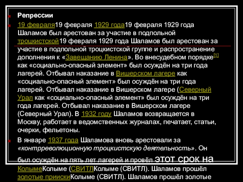 за участие в подпольной троцкистской19 февраля 1929 года Шаламов был арестован за участие в подпольной троцкистской группе и распространение дополнения к «Завещанию Ленина». Во внесудебном порядке[1] как «социально-опасный элемент» был осуждён на три года лагерей. Отбывал наказание в Вишерском лагере как «социально-опасный элемент» был осуждён на три года лагерей. Отбывал наказание в Вишерском лагере (Северный Урал как «социально-опасный элемент» был осуждён на три года лагерей. Отбывал наказание в Вишерском лагере (Северный Урал). В 1932 году Шаламов возвращается в Москву, работает в ведомственных журналах, печатает, статьи, очерки, фельетоны.