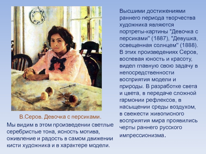 Мы видим в этом произведении светлые серебристые тона, ясность мотива, оживление и радость в самом движении кисти художника и в характере модели.