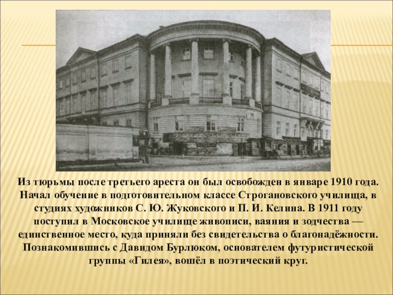 года. Начал обучение в подготовительном классе Строгановского училища, в студиях художников С. Ю. Жуковского и П. И. Келина. В 1911 году поступил в Московское училище живописи, ваяния и зодчества — единственное место, куда приняли без свидетельства о благонадёжности. Познакомившись с Давидом Бурлюком, основателем футуристической группы «Гилея», вошёл в поэтический круг.