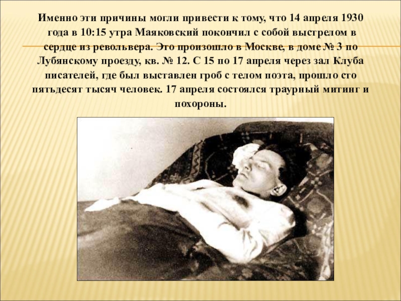 года в 10:15 утра Маяковский покончил с собой выстрелом в