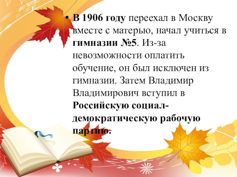 в гимназии №5. Из-за невозможности оплатить обучение, он был исключен из гимназии. Затем Владимир Владимирович вступил в Российскую социал-демократическую рабочую партию.