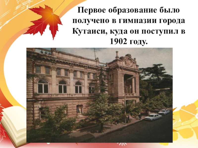 Слайд 5Первое образование было получено в гимназии города Кутаиси, куда он поступил