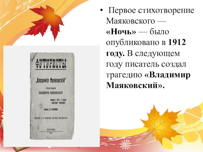 Слайд 7 Первое стихотворение Маяковского — «Ночь» — было опубликовано в 1912 году.