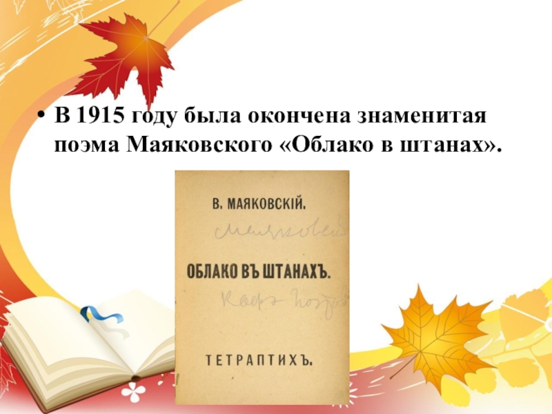 В 1915 году была окончена знаменитая поэма Маяковского «Облако в штанах».