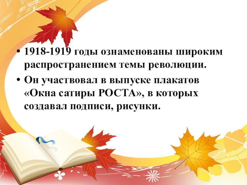 1918-1919 годы ознаменованы широким распространением темы революции. Он участвовал в выпуске плакатов «Окна сатиры РОСТА», в которых создавал