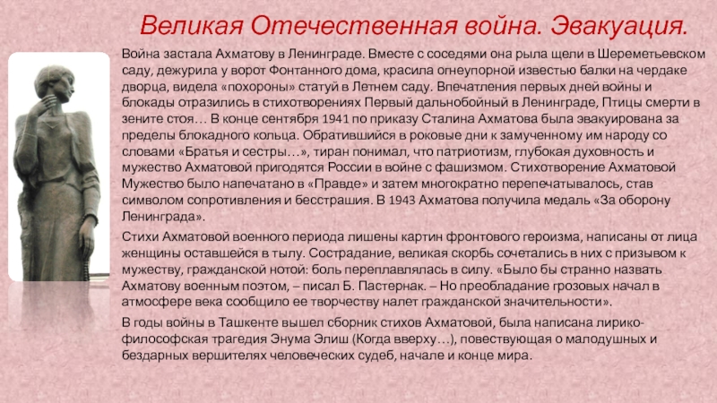время тяжелейших бомбежек, она выступает по радио с обращением к женщинам Ленинграда. Вместе со всеми она дежурит на крышах, роет окопы вокруг города. В конце сентября ее по решению горкома партии самолетом эвакуируют из Ленинграда – по иронии судьбы, теперь ее признали достаточно важной персоной, чтобы спасти... Через Москву, Казань и Чистополь Ахматова оказалась в Ташкенте.