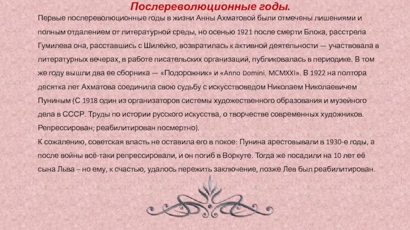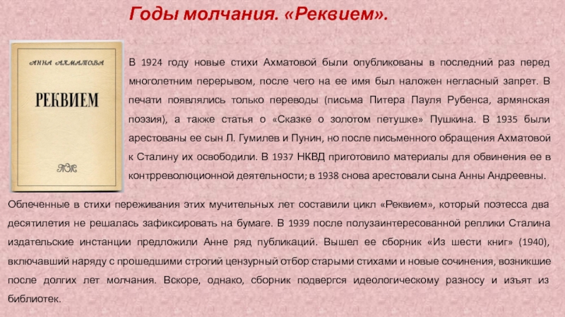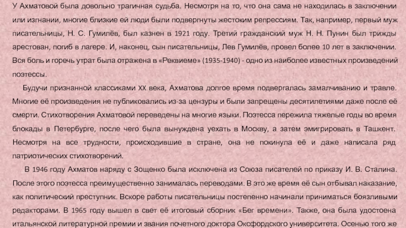 сама не находилась в заключении или изгнании, многие близкие ей люди были подвергнуты жестоким репрессиям. Так, например, первый муж писательницы, Н. С. Гумилёв, был казнен в 1921 году. Третий гражданский муж Н. Н. Пунин был трижды арестован, погиб в лагере. И, наконец, сын писательницы, Лев Гумилёв, провел более 10 лет в заключении. Вся боль и горечь утрат была отражена в «Реквиеме» (1935-1940) - одно из наиболее известных произведений поэтессы.