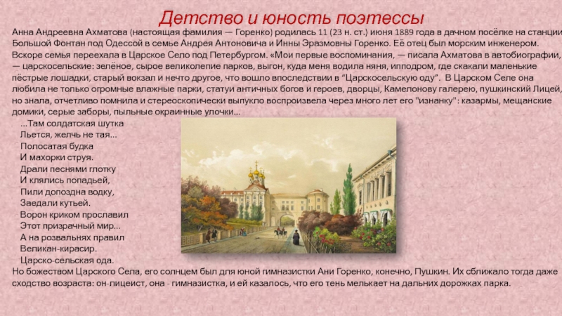 известных русских поэтесс XX века, литературный критик и переводчица. Родилась 11 (23) июня 1889 года в дворянской семье в Одессе. Когда девочке был 1 год, семья переехала в Царское село, где Ахматова смогла посещать Мариинскую гимназию. Она была настолько талантлива, что ей удалось освоить французский язык, слушая, как учительница занимается со старшими детьми. Во время проживания в Петербурге, Ахматова застала частичку эпохи, в которой жил Пушкин и это наложило отпечаток на её творчество.
