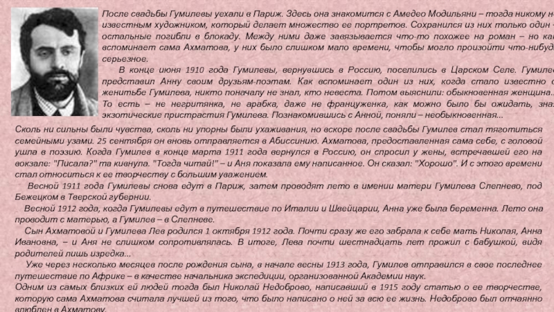 Слайд 10После свадьбы Гумилевы уехали в Париж. Здесь она знакомится с Амедео