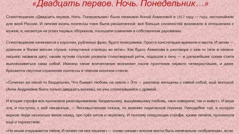 Стихотворение «Двадцать первое. Ночь. Понедельник» было написано Анной