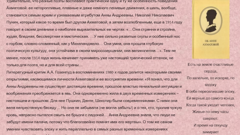 поведения Ахматовой: ее неторопливые, плавные и даже немного ленивые движения, а шаль, вообще, становится самым ярким и узнаваемым атрибутом Анны Андреевны. Николай Николаевич Пунин, который какое-то время был другом Ахматовой, а затем возлюбленным, еще в 1914 году говорит в своем дневнике о наиболее выразительных ее чертах: «…Она странна и стройна, худая, бледная, бессмертная и мистическая. …У нее сильно развитые скулы и особенный нос с горбом, словно сломанный, как у Микеланджело… Она умна, она прошла глубокую поэтическую культуру, она устойчива в своем миросозерцании, она великолепна…». Тем не менее, после 1914 года жизнь начинает принимать уже настоящий трагический оттенок, не только для поэта, но и для всей страны…