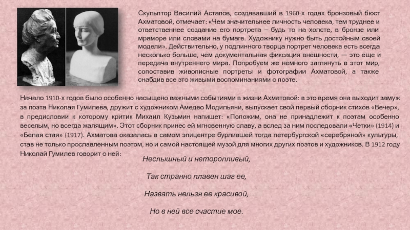 Слайд 29Скульптор Василий Астапов, создававший в 1960-х годах бронзовый бюст Ахматовой, отмечает: