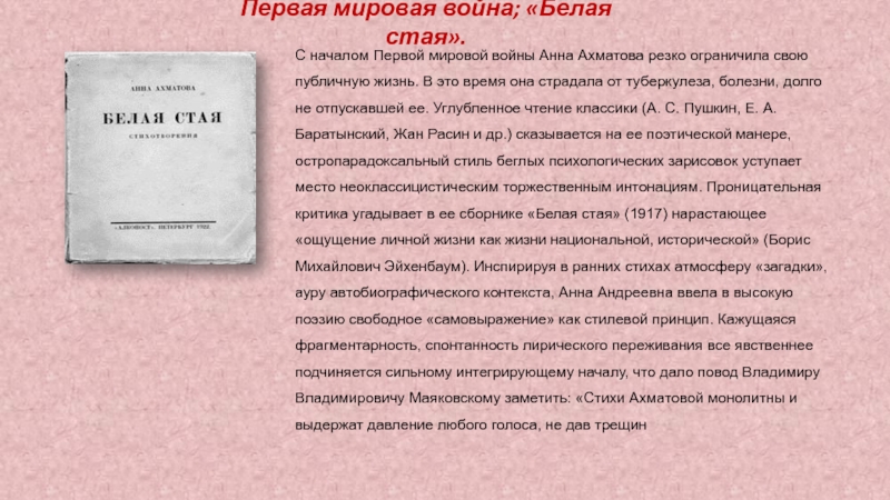 резко ограничила свою публичную жизнь. В это время она страдала от туберкулеза, болезни, долго не отпускавшей ее. Углубленное чтение классики (А. С. Пушкин, Е. А. Баратынский, Жан Расин и др.) сказывается на ее поэтической манере, остропарадоксальный стиль беглых психологических зарисовок уступает место неоклассицистическим торжественным интонациям. Проницательная критика угадывает в ее сборнике «Белая стая» (1917) нарастающее «ощущение личной жизни как жизни национальной, исторической» (Борис Михайлович Эйхенбаум). Инспирируя в ранних стихах атмосферу «загадки», ауру автобиографического контекста, Анна Андреевна ввела в высокую поэзию свободное «самовыражение» как стилевой принцип. Кажущаяся фрагментарность, спонтанность лирического переживания все явственнее подчиняется сильному интегрирующему началу, что дало повод Владимиру Владимировичу Маяковскому заметить: «Стихи Ахматовой монолитны и выдержат давление любого голоса, не дав трещин