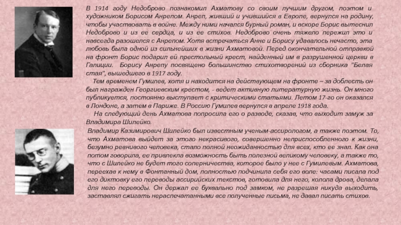 Слайд 11В 1914 году Недоброво познакомил Ахматову со своим лучшим другом, поэтом