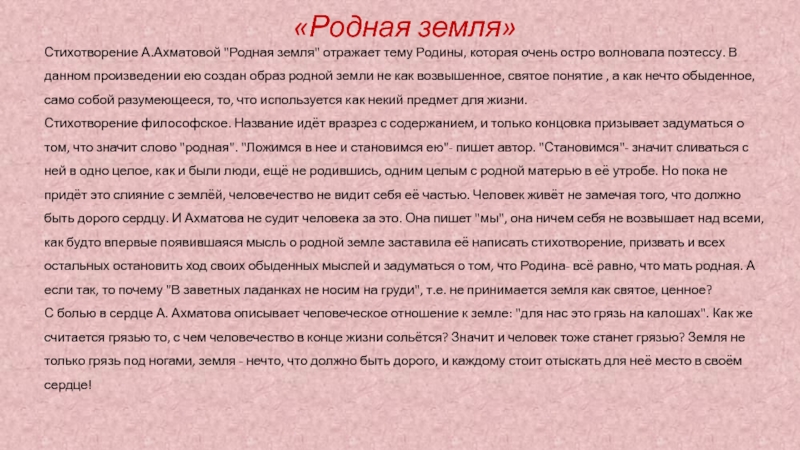 Стихотворение философское. Название идёт вразрез с содержанием, и только концовка призывает задуматься о том, что значит слово "родная". "Ложимся в нее и становимся ею"- пишет автор. "Становимся"- значит сливаться с ней в одно целое, как и были люди, ещё не родившись, одним целым с родной матерью в её утробе. Но пока не придёт это слияние с землёй, человечество не видит себя её частью. Человек живёт не замечая того, что должно быть дорого сердцу. И Ахматова не судит человека за это. Она пишет "мы", она ничем себя не возвышает над всеми, как будто впервые появившаяся мысль о родной земле заставила её написать стихотворение, призвать и всех остальных остановить ход своих обыденных мыслей и задуматься о том, что Родина- всё равно, что мать родная. А если так, то почему "В заветных ладанках не носим на груди", т.е. не принимается земля как святое, ценное?