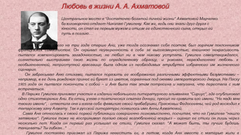 жизни” Ахматовой Марченко безоговорочно отдает Николаю Гумилеву. Как же, ведь они знали друг друга с юности, он стал ее первым мужем и отцом ее единственного сына, открыл ей путь в поэзию…